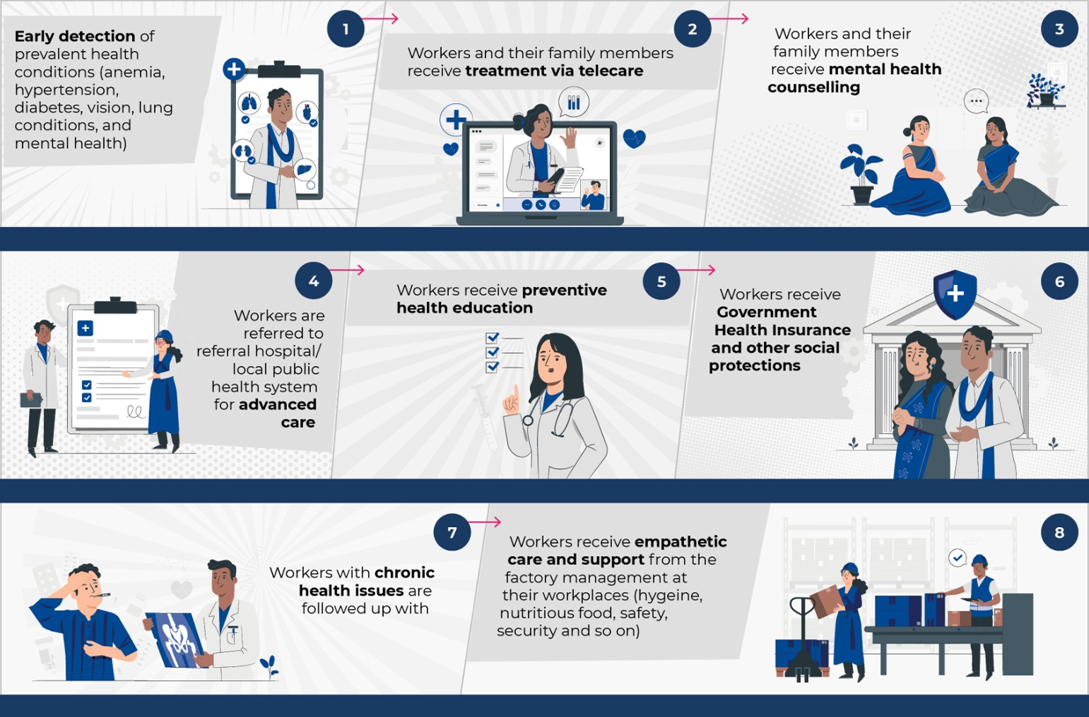 The interventions ensure parity in access to health services for both genders. Employing a series of targeted capacity-building sessions, it actively tackles financial literacy issues, empowering the female workforce to make informed and independent financial decisions.